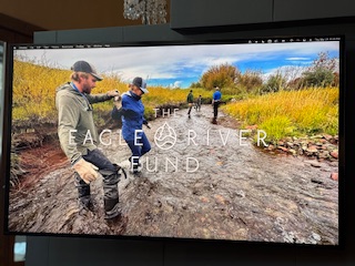 To close the evening, Margie Gart shared about opportunities to support the Eagle River Fund, which include sharing about the effort to friends and neighbors and gifts of various levels. She noted that she and her husband Tom will be matching gifts of $50,000-$100,000, up to $1,000,000. Additionally, 77 opportunities will be available at $25,000 for River Partner-level supporters to each be symbolically recognized on public signage as supporting one mile of the 77-mile-long Eagle River. As a community-driven initiative intended to aid in the protection of the Eagle River for generations, gifts of any size are encouraged and welcome.